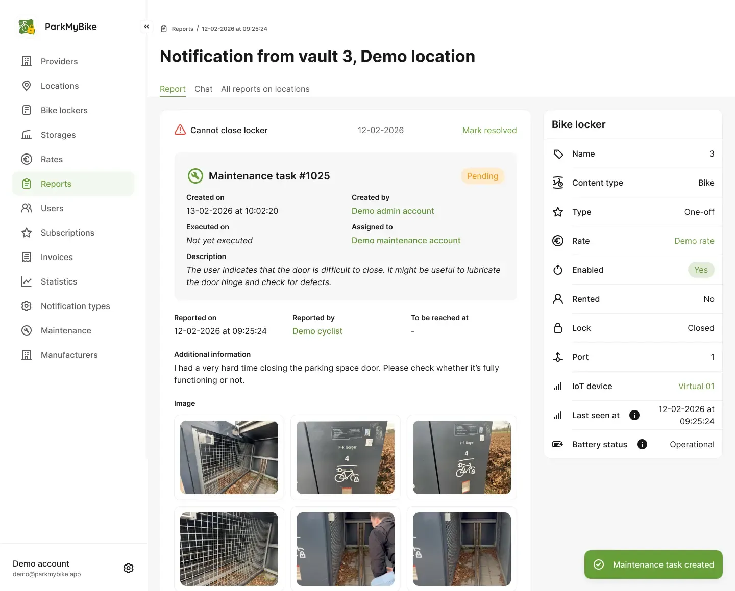 The maintenance partner then schedules the task and assigns it to a technician, who can see it directly in the ParkMyBike app. This ensures everyone knows what needs to happen and keeps the status of each task transparent from start to finish.